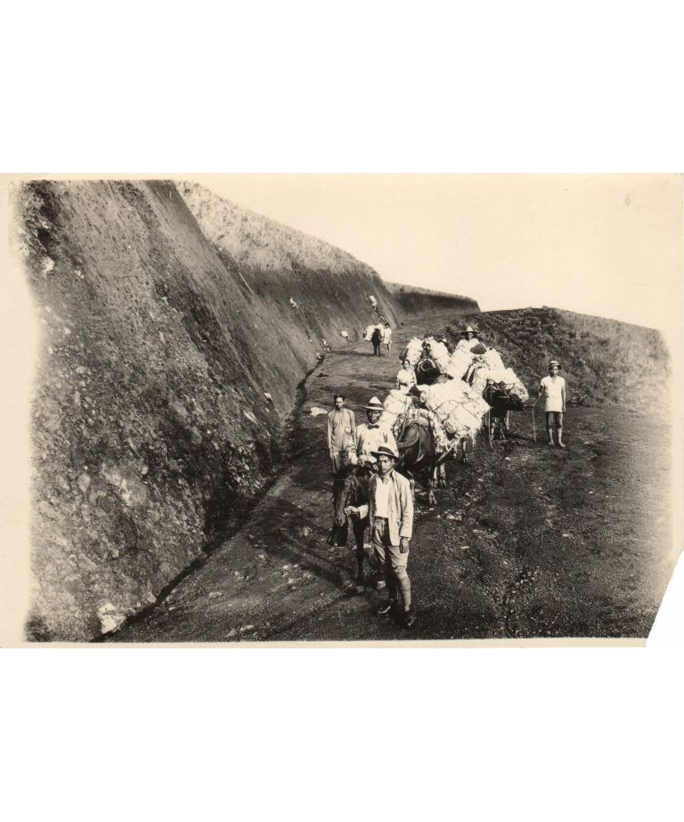 Animals heavily loaded with hemp [on a steep mountain road]. Kalasangay, Bukidnon Province.