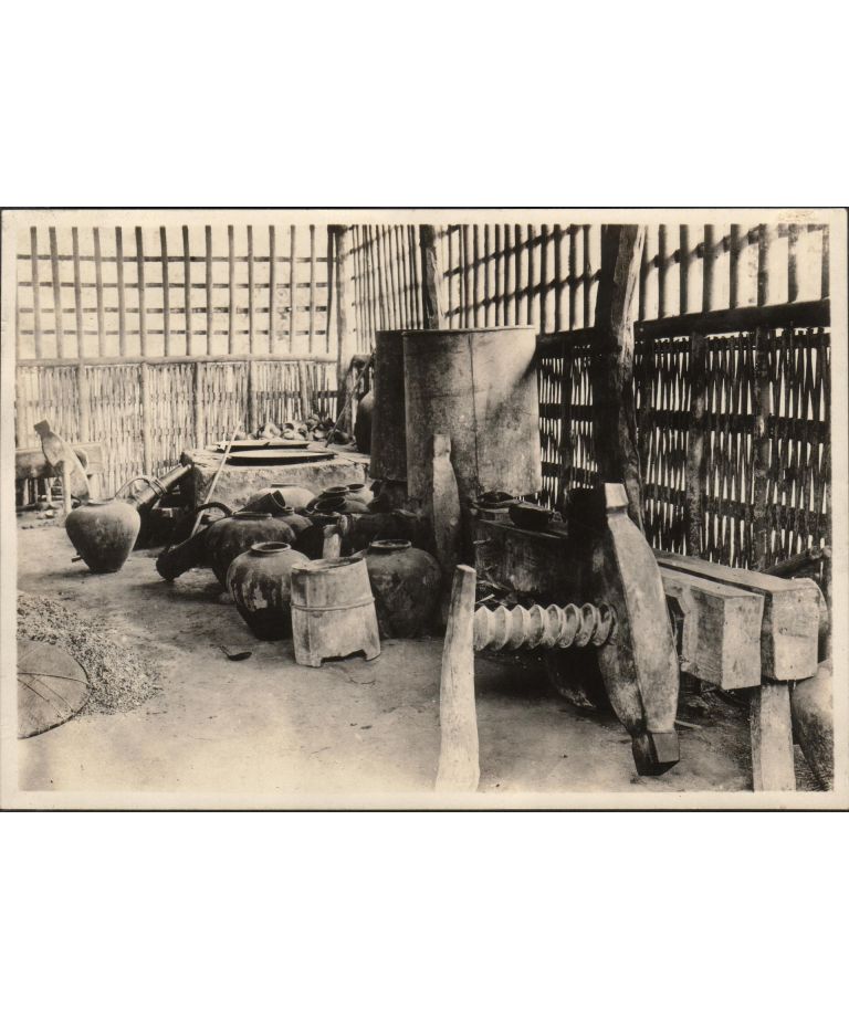 An excellent view of the ansive [?] primitive copra press showing screw.