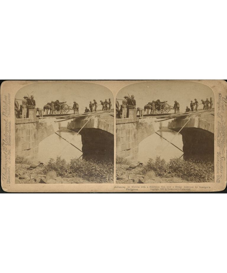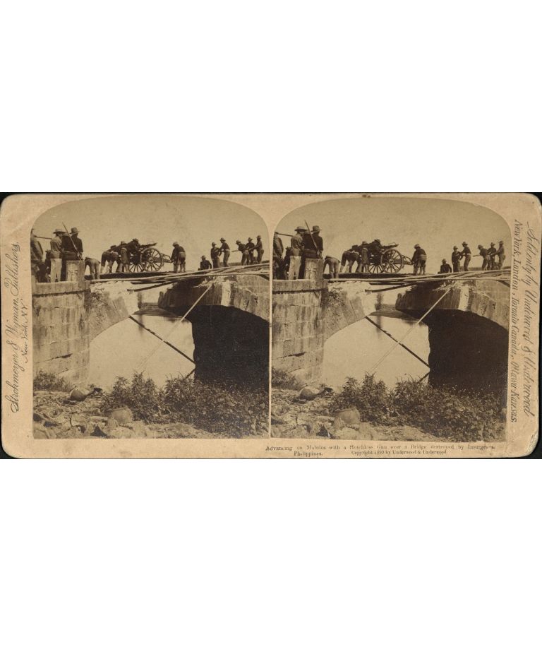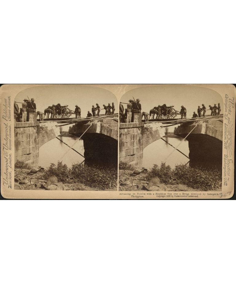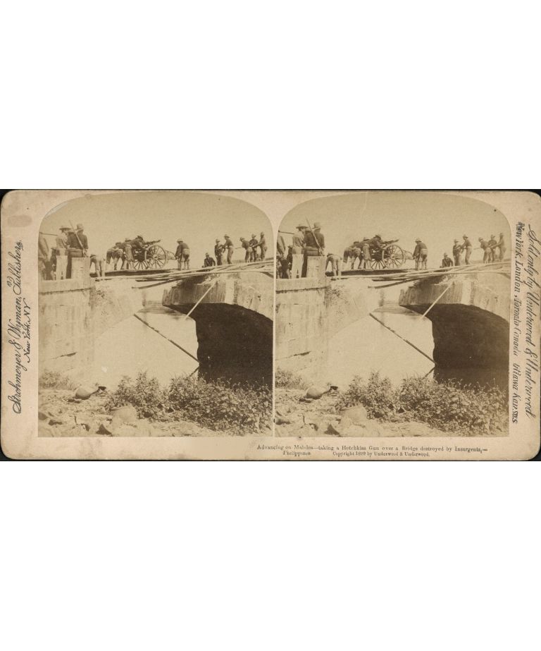 Advancing on Malolos with a Hotchkiss Gun over a Bridge destroyed by Insurgents, Philippines.