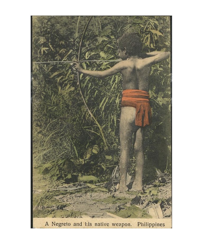A Negreto [Negrito - Aeta] and his native weapon. Philippines.