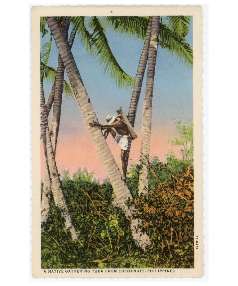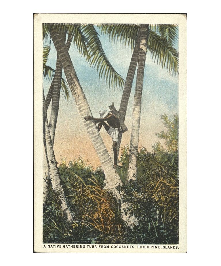 A native gathering tuba from cocoanuts, Philippine Islands.