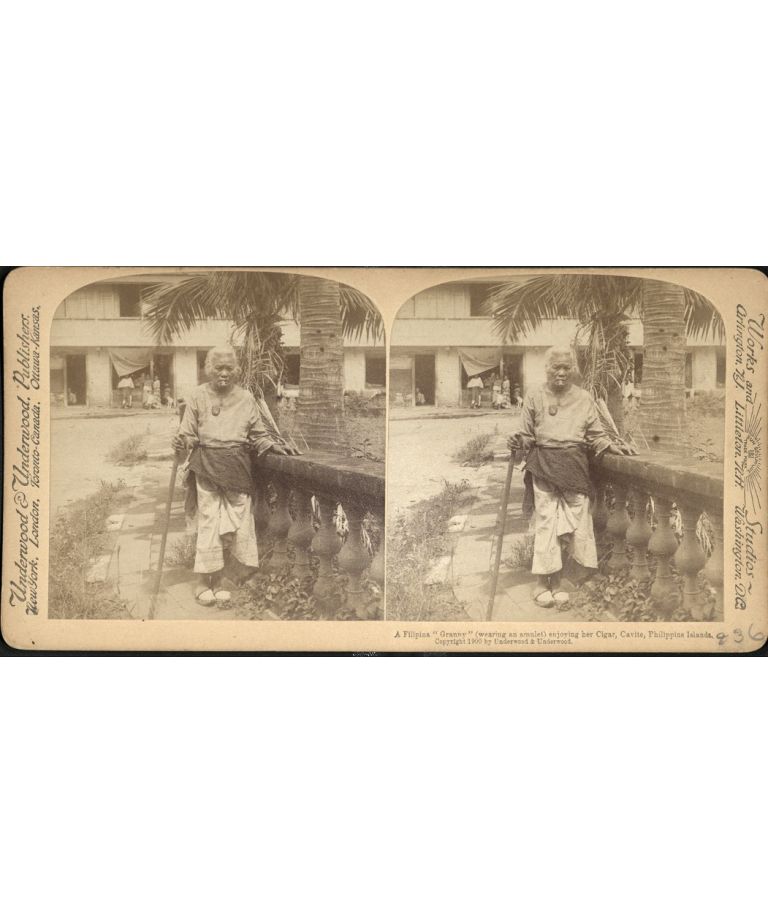 A Filipina "Granny" (wearing an amulet) enjoying her Cigar, Cavite, Philippine Islands.