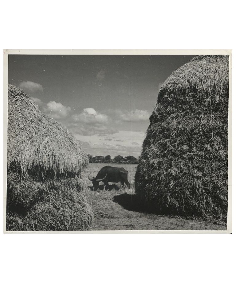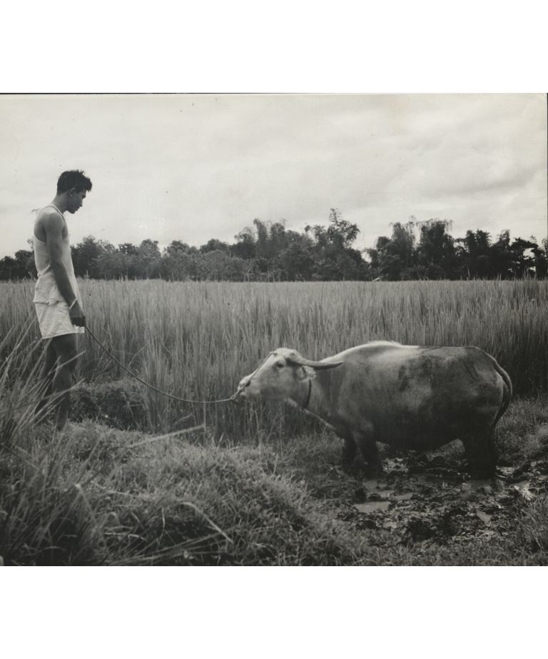 357. PHILIPPINES. After respite from the heat in the water hole, the carabao is being led back to the field.