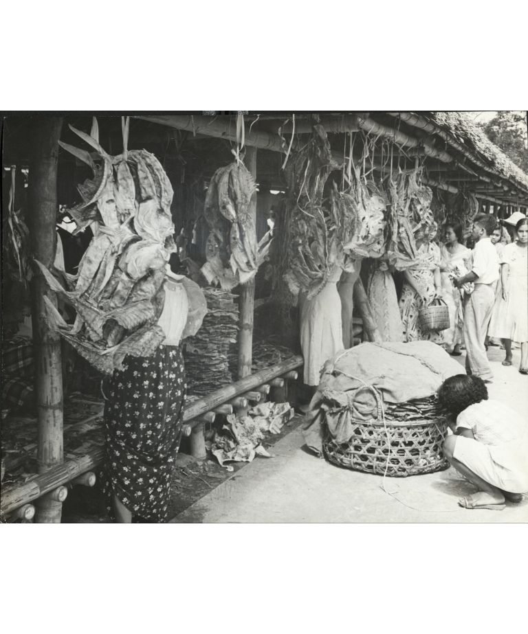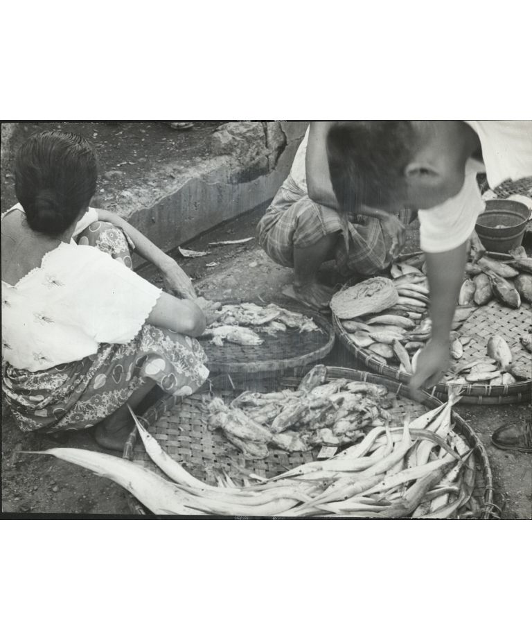 336. PHILIPPINES: Shopping for dried fish in a Baguio market. The covered basket in fore-front also contains this food.