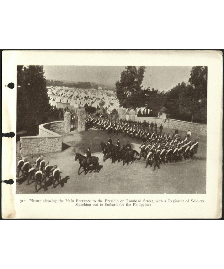 310. Picture showing the main entrance to the Presidio on Lombard Street, with a regiment of soldiers marching out to embark for the Philippines.