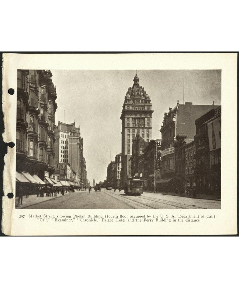 307. Market Street, showing Phelan Building (fourth floor occupied by the U.S.A., Department of Cal.) "Call," "Examiner," "Chronicle," Palace Hotel and the Ferry Building in the distance.