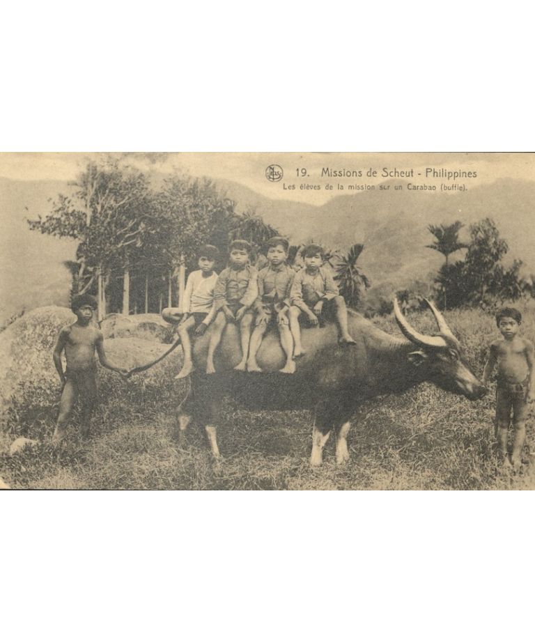 19. Missions de Scheut � Philippines. Les �leves de la mission sur un Carabao (buffle). [The pupils of the mission on a Carabao (buffalo).]