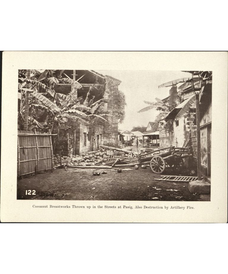 122. Cocoanut [Coconut] breastworks thrown up in the streets at Pasig. Also destruction by artillery fire.
