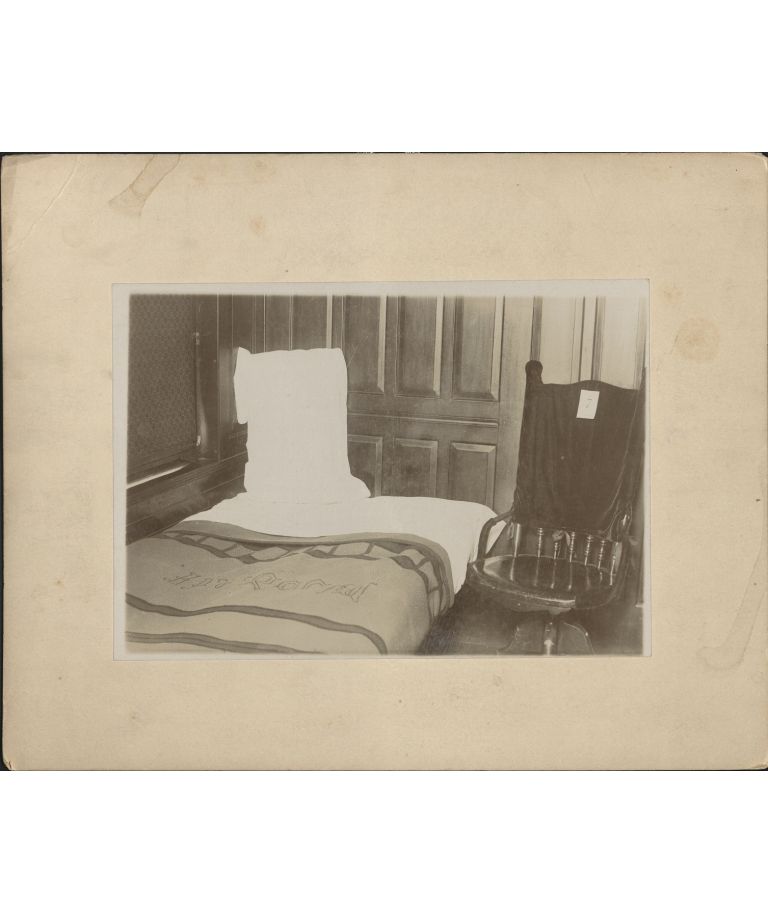 [Untitled � Bed, pillow, and chair. Hotel room?].