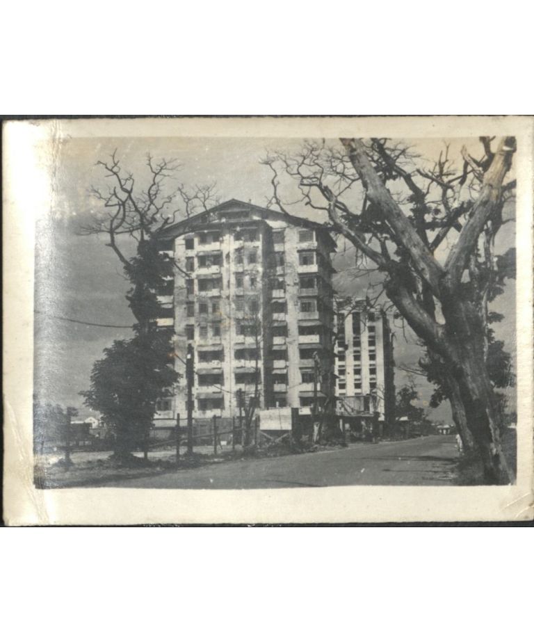 [Untitled - War-damaged Peralta Apartments with Bay View Hotel in background].