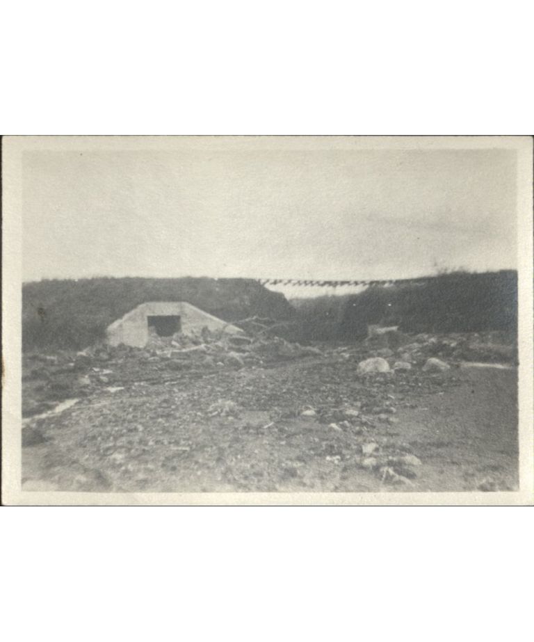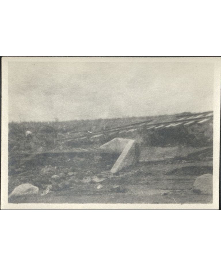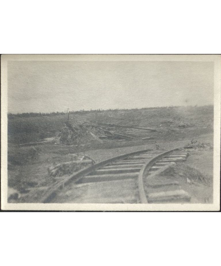 [Untitled - Washed-out bridge and railroad tracks covered with dirt and rocks after a flood or landslide].
