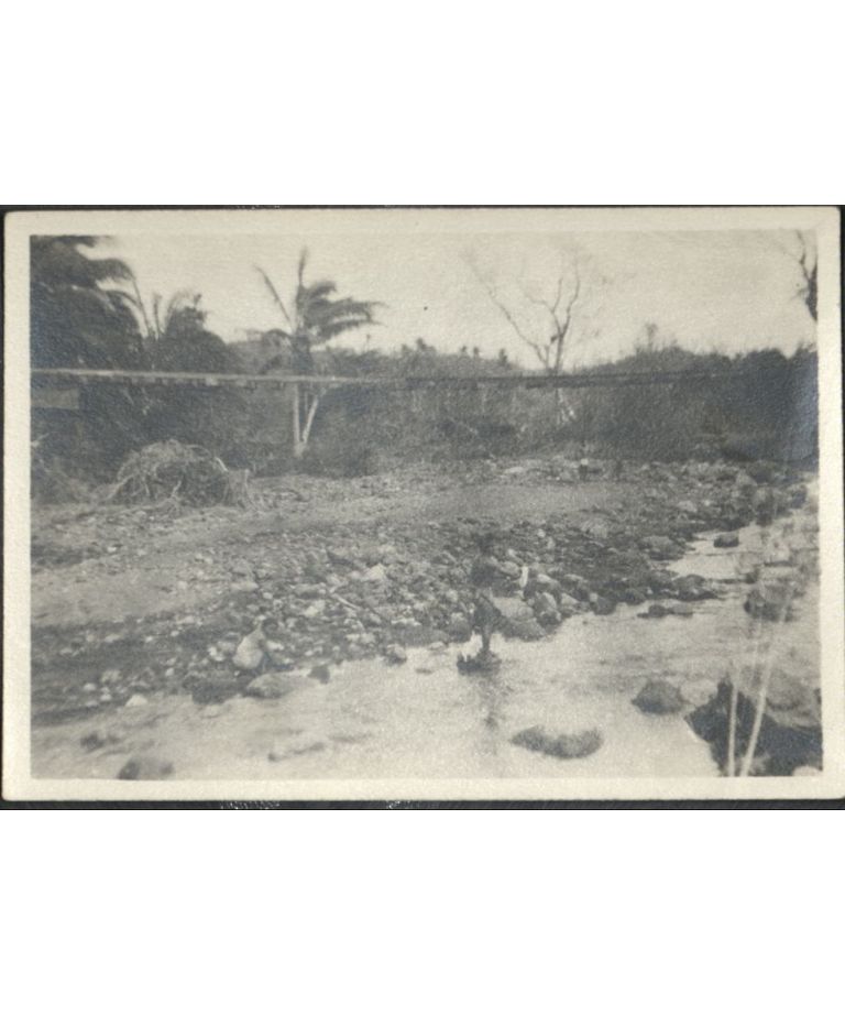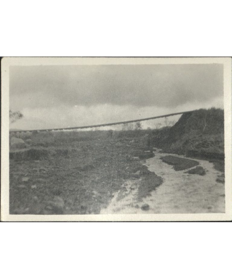 [Untitled - Washed-out bridge and railroad tracks hanging in mid-air after a flood or landslide].