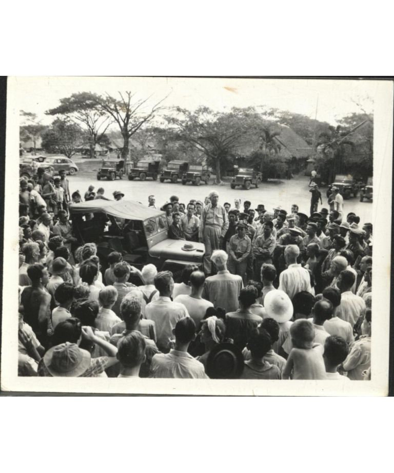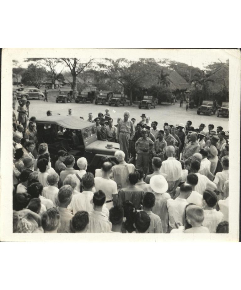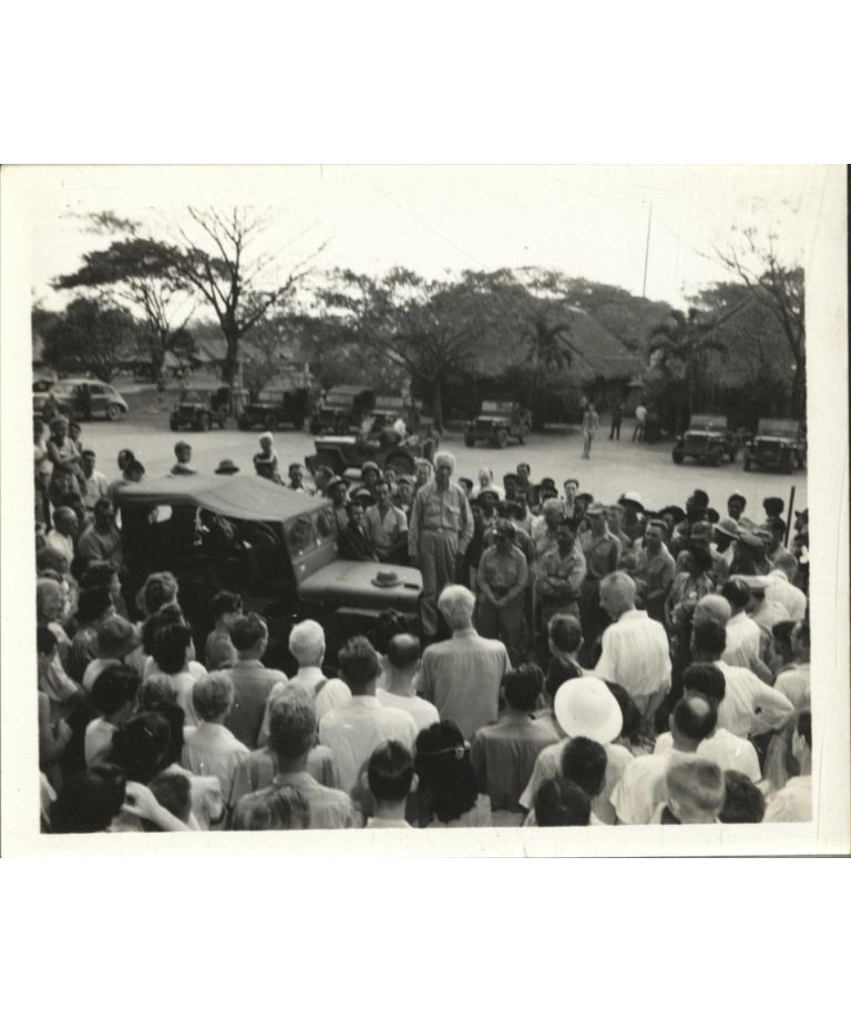 [Untitled - Philippine president Sergio Osmena speaks to crowd of freed detainees, Santo Tomas Internment Camp].