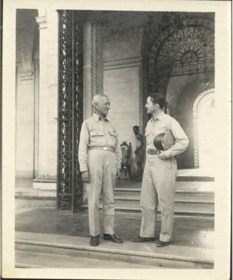 [Untitled - Philippine president Sergio Osmena talks to a U.S. officer at Kalayaan Hall, Malacanang Palace].