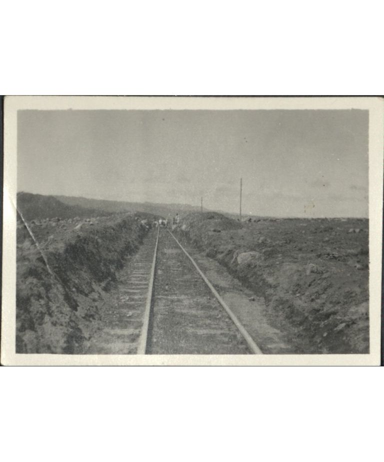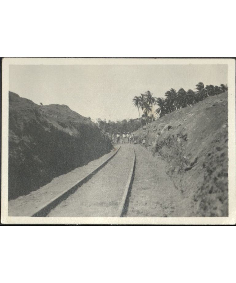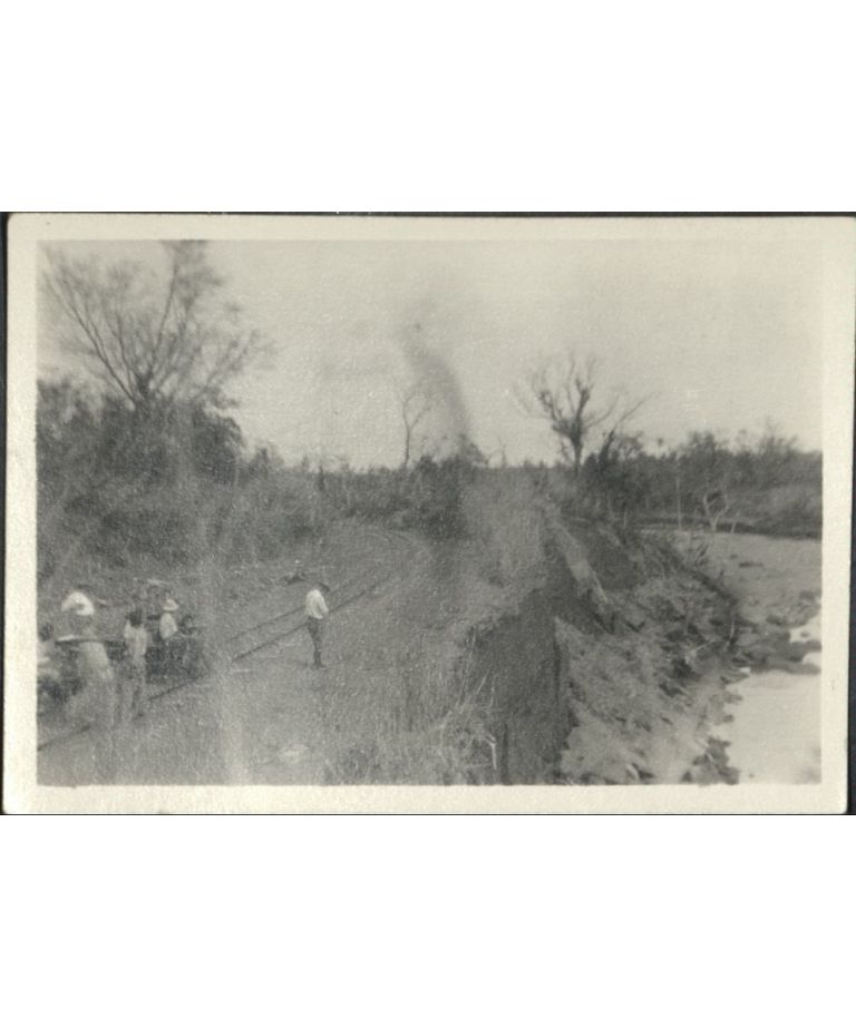 [Untitled - Men inspect railroad tracks barely missed by flood or landslide erosion].