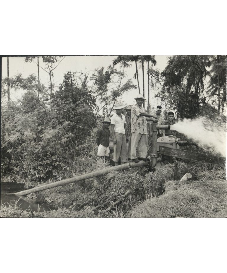 [Untitled - Men point to water flowing from a pump over a small stream].