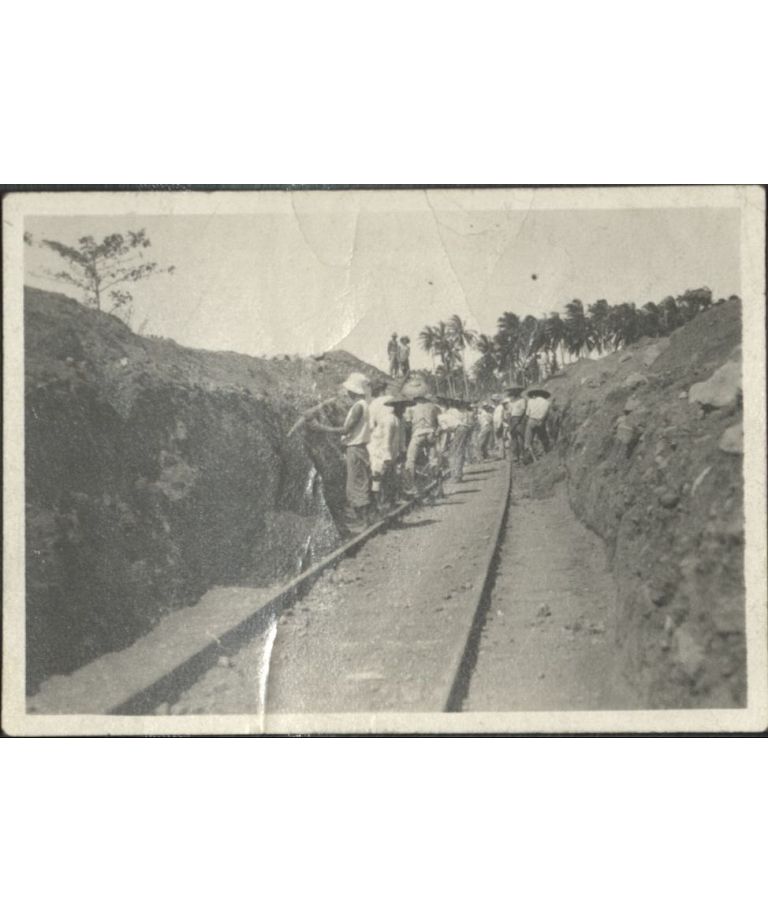 [Untitled - Men excavate railroad tracks covered with dirt and rocks after a flood or landslide].