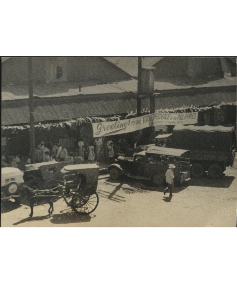 [Untitled - Manila street scene and banner: "Greetings to the Independence of the Philippines"].