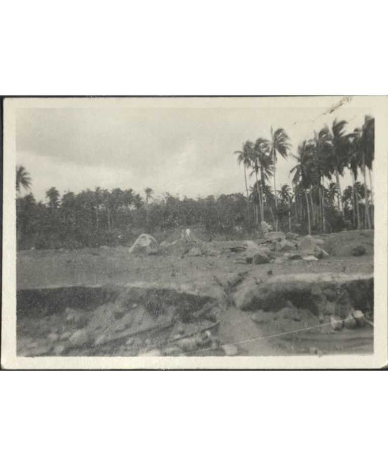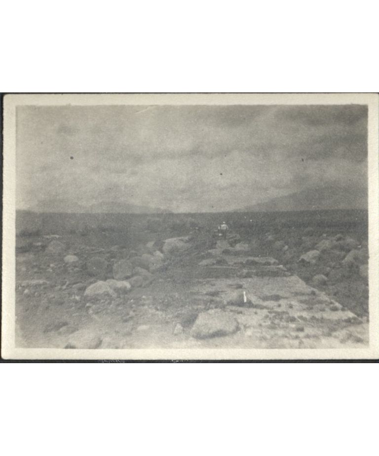 [Untitled - Man in distance inspecting washed-out bridge and railroad tracks covered with dirt and rocks after a flood or landslide].