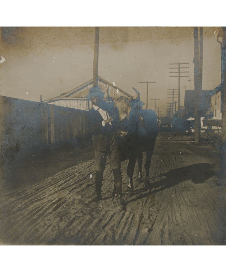 [Untitled - Man inspects railroad tracks covered with dirt and rocks after a flood or landslide].