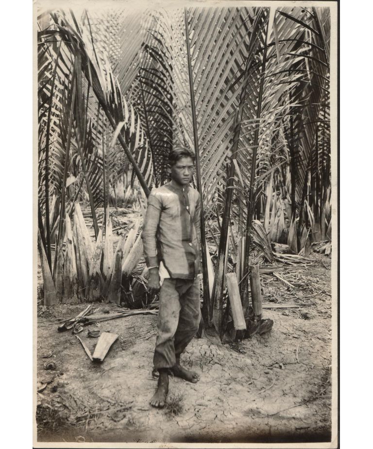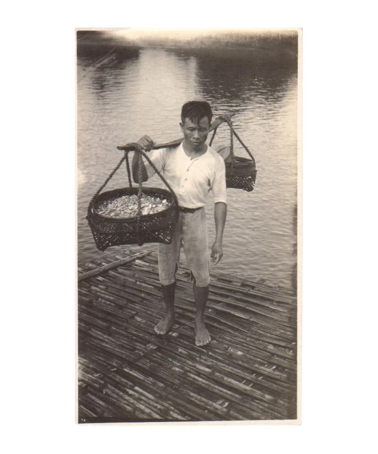 [Untitled - Man carrying baskets of small fish on a bamboo raft or dock].