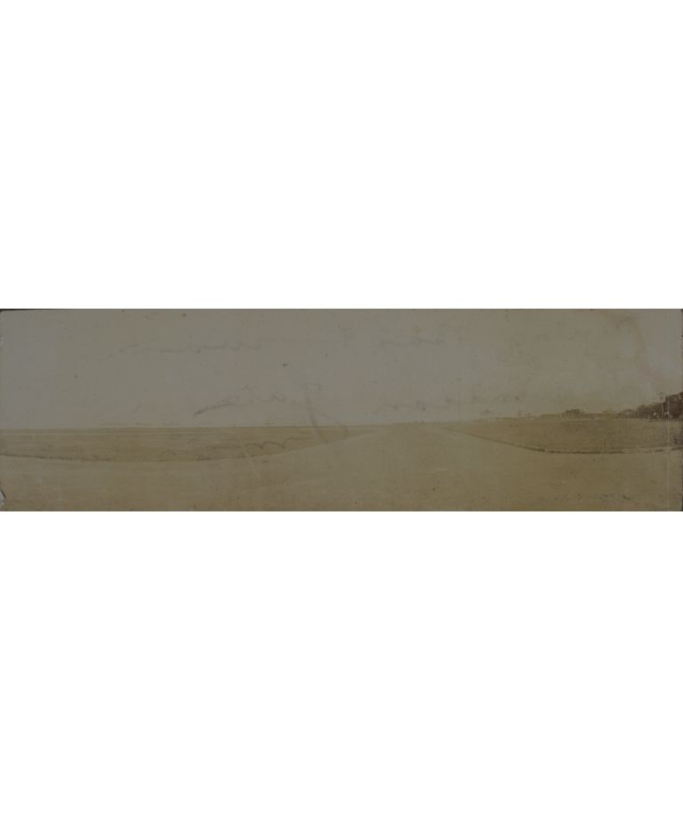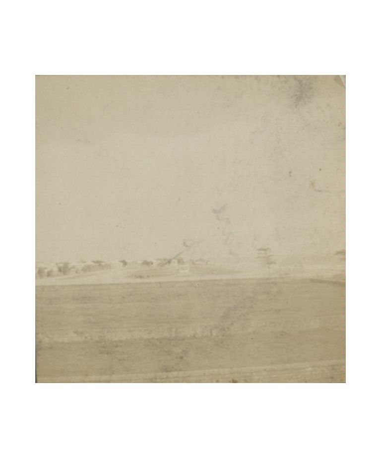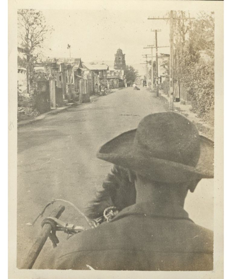 [Untitled - Looking over a cochero's shoulder down a street with a bell tower].