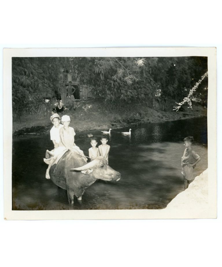 [Untitled - Filipino children ride a carabo in a small river].