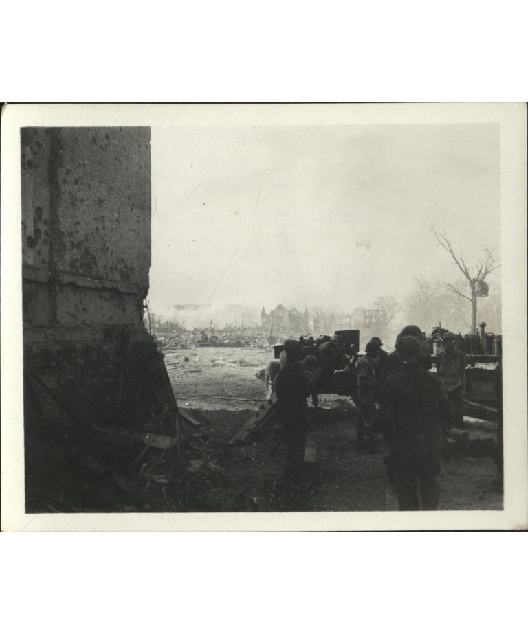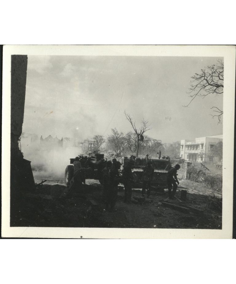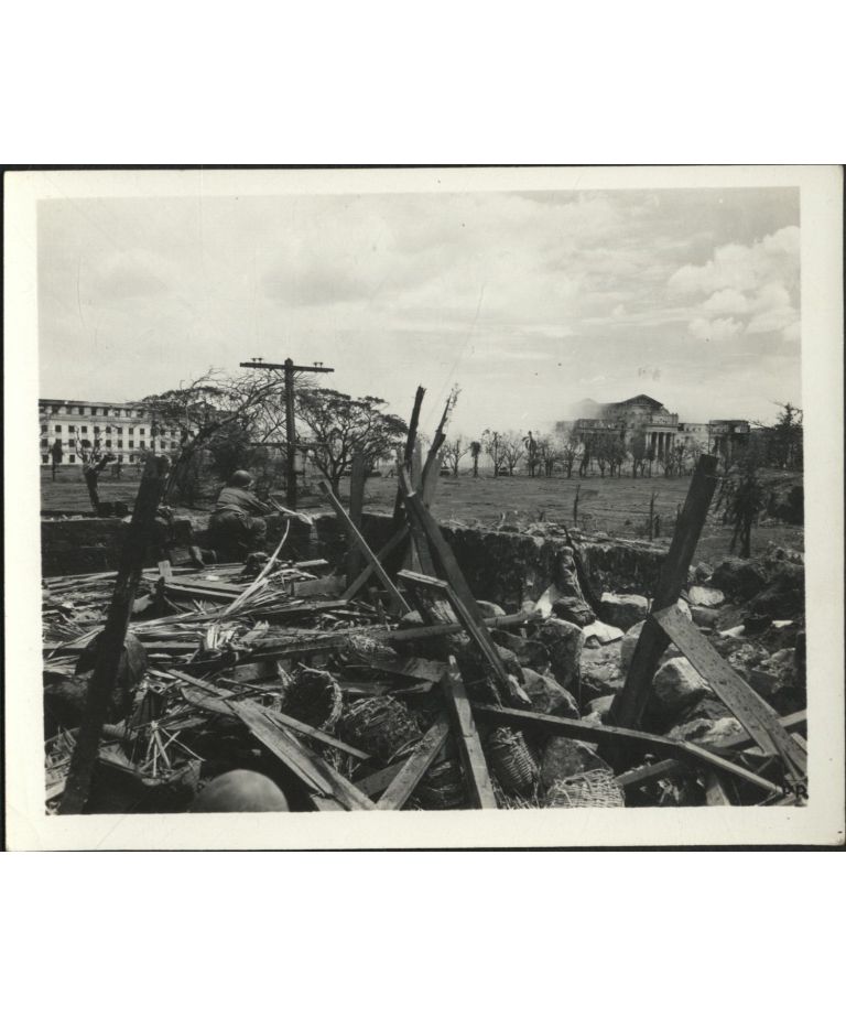 [Untitled - Destruction in Manila during liberation: Artillery firing from Legislative Building (?) toward Ermita and Central Methodist Church, February 1945].