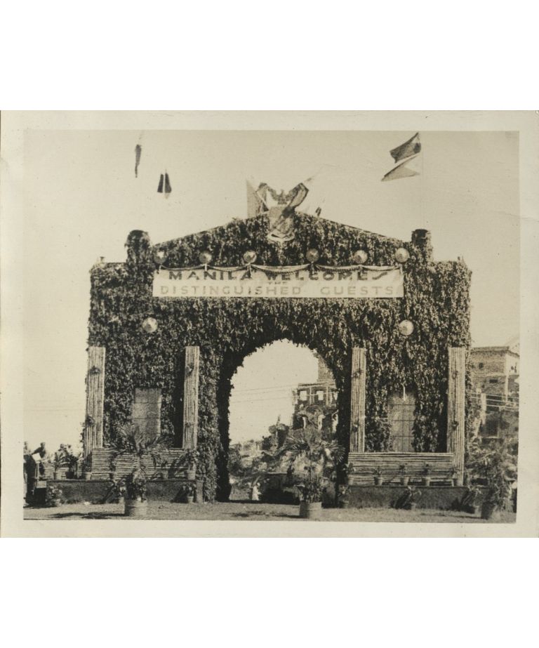 [Untitled - Decorated arch by Legislative Building ruins: "Manila welcomes distinguished guests"].