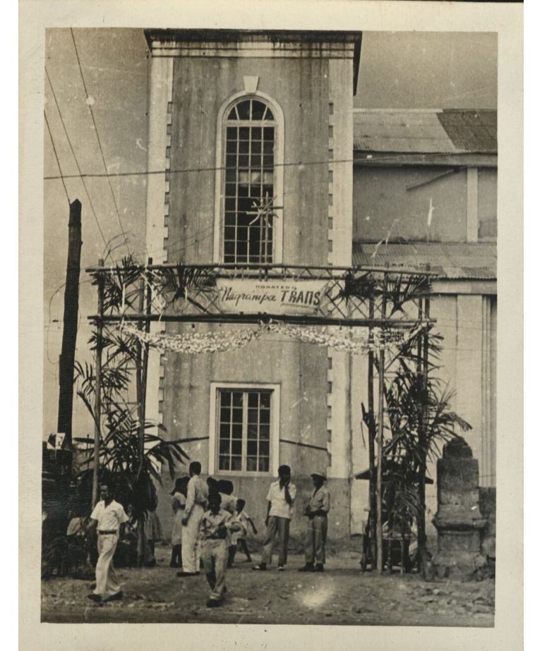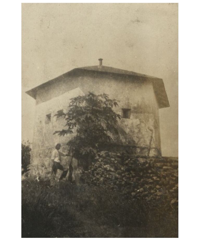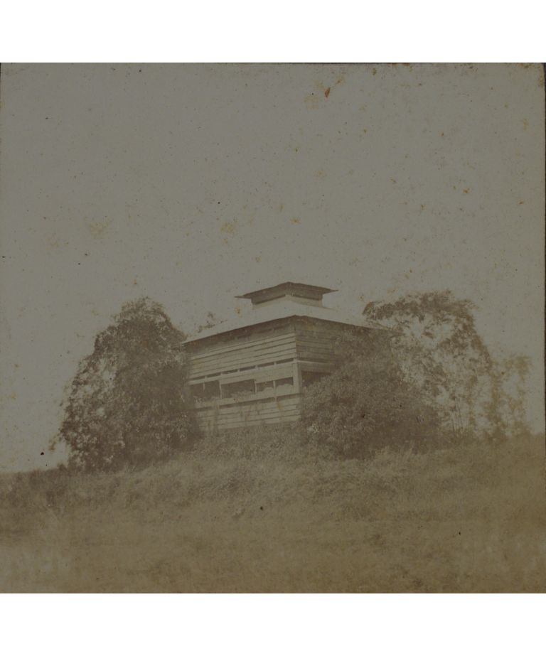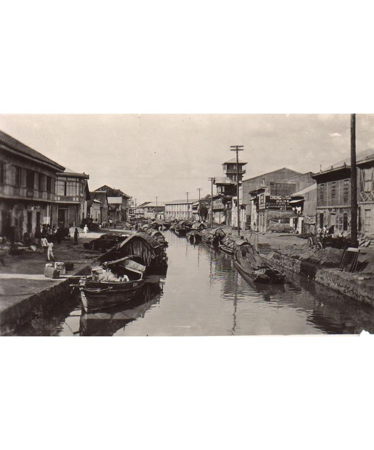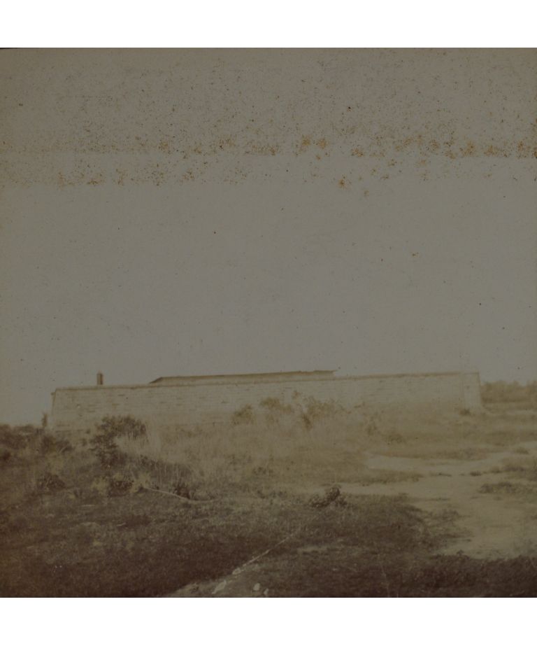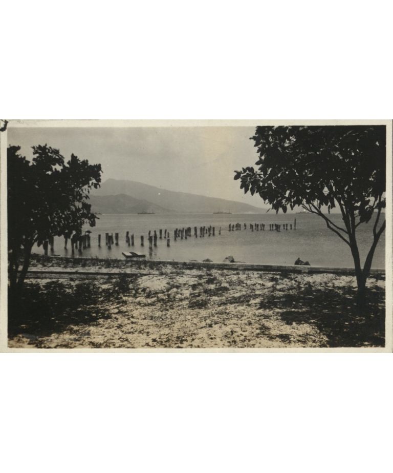 [Untitled - Beach, old pilings, warships in channel, Subic Bay?].