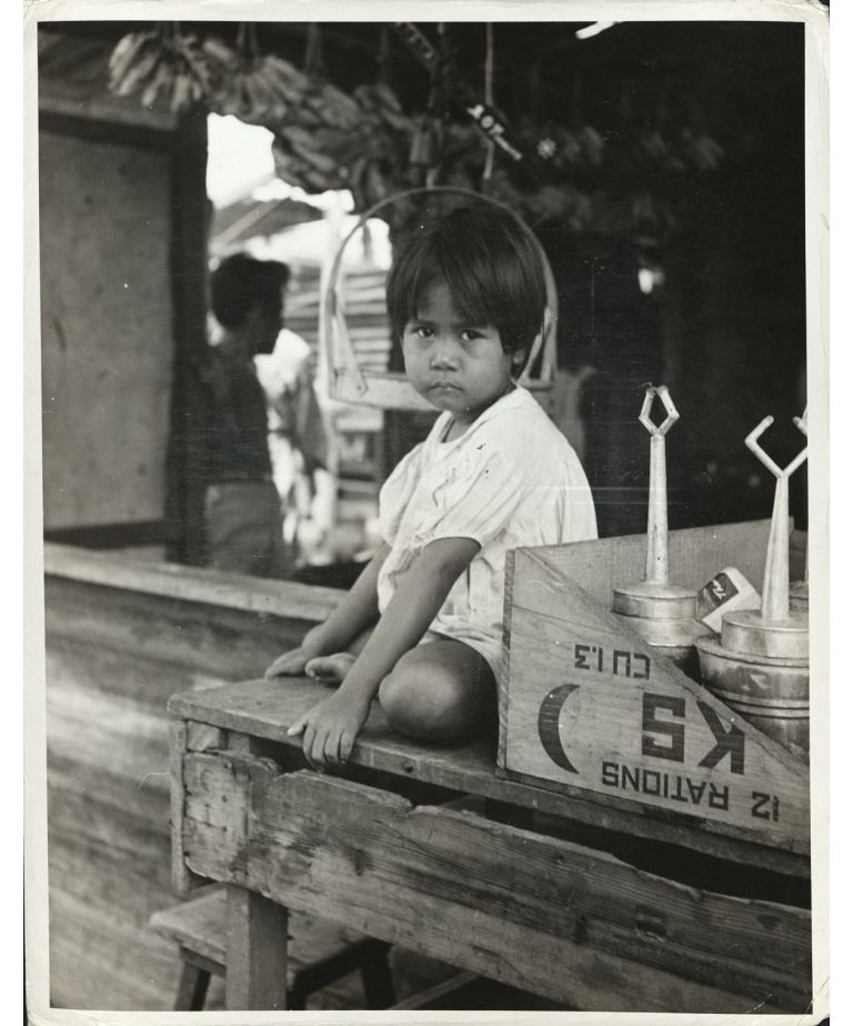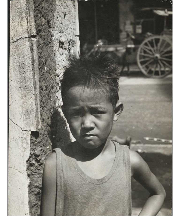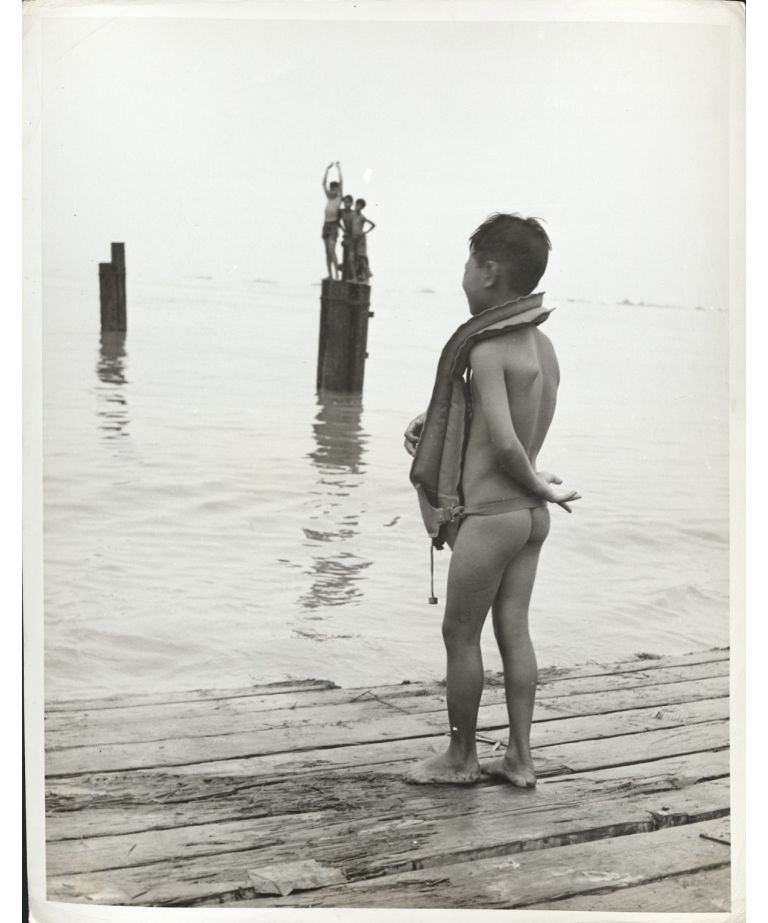 [Caption missing - Two Filipino boys, one wearing life preserver, on dock].