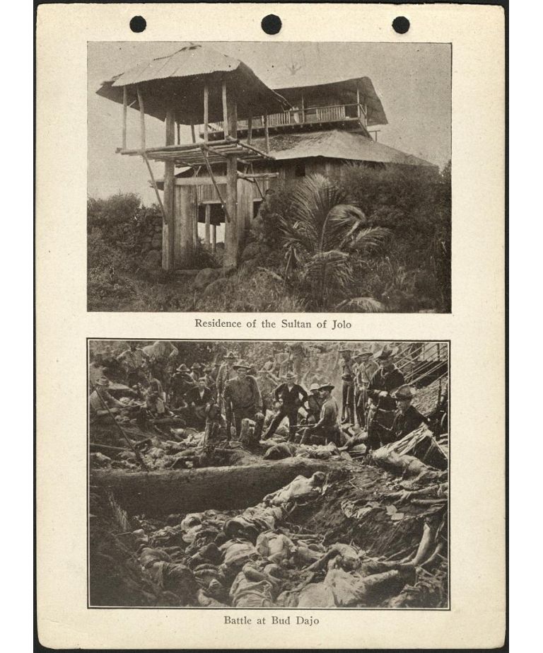 (Top) Residence of the Sultan of Jolo. / (Bottom) Battle at Bud Dajo.