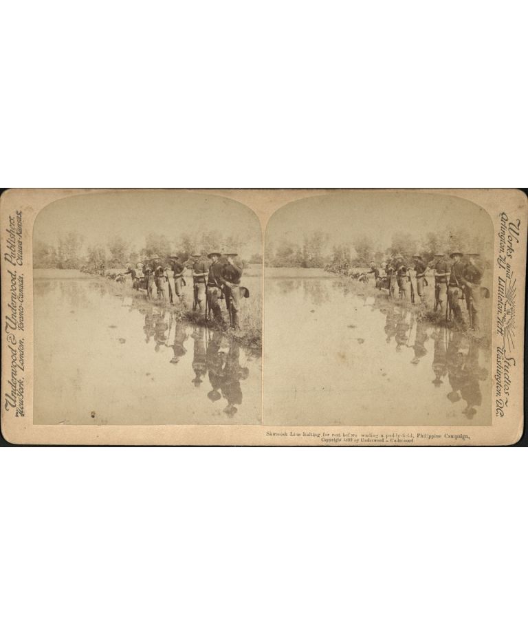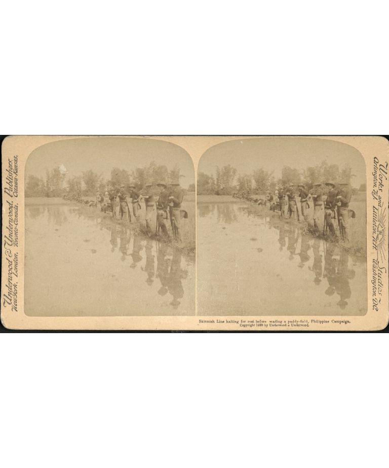 Skirmish Line halting for rest before wading a paddy-field, Philippine Campaign.