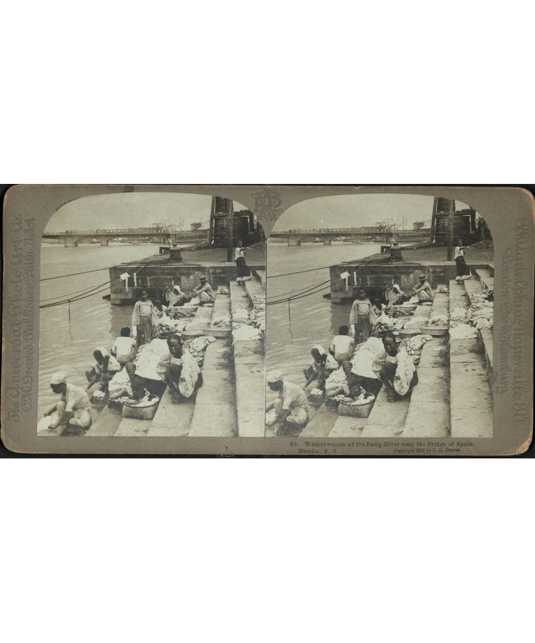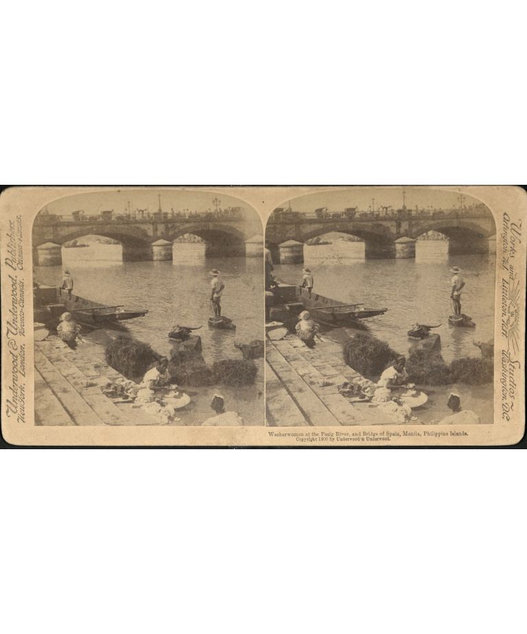 Washerwomen at the Pasig River, and Bridge of Spain, Manila, Philippine Islands.