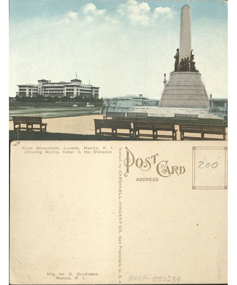 Rizal Monument, Luneta, Manila, P. I. Showing Manila Hotel in the Distance.