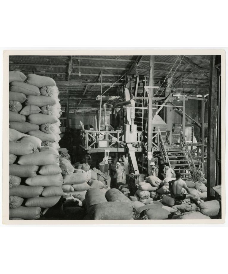 Rice cultivation as 2000 years ago. [Rice bags piling up in a warehouse].