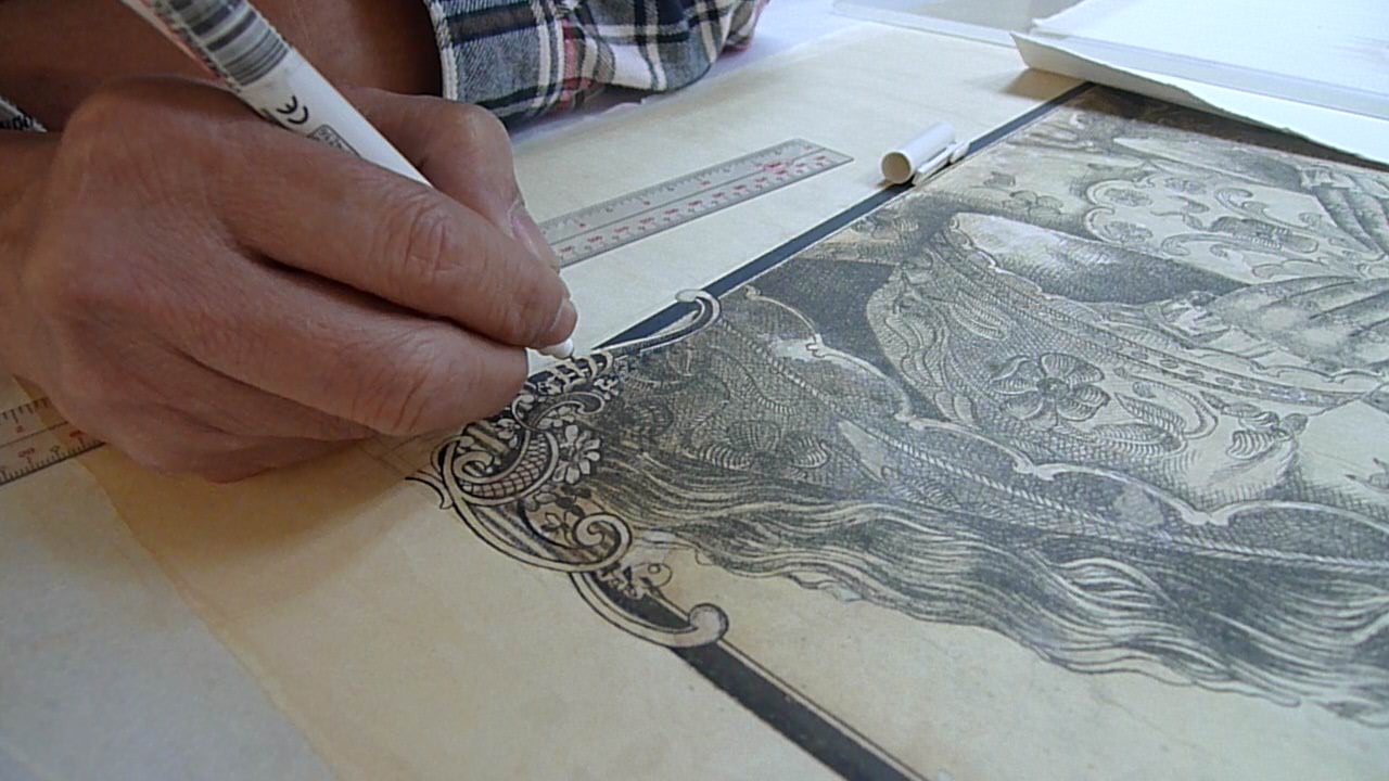 Also known as "In-painting" or "Image integration". This is an optional process in restoration. It fills in the missing details of the print to better appreciate the object.