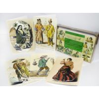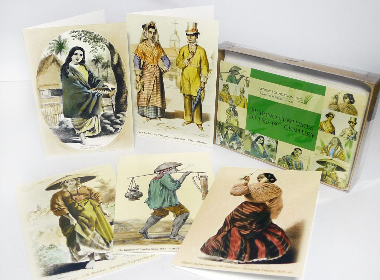 Thanks to rapidly developing print technology mid-nineteenth century saw an upsurge in the number of illustrated newspapers and magazines around the world. Artists were employed to draw and paint beautiful and exotic sights and reproduce them as engravings and color lithographs. The lovely Filipino costumes used for these note cards first appeared in "Ilustración Filipina" here in Manila, in the "London Illustrated News" and in other publications abroad. They capture the elegant and graceful attire of cosmopolitan Filipino city dwellers and the rustic wear of the simple provincial inhabitants.