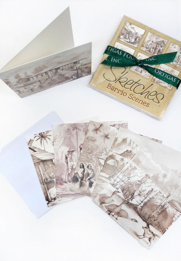 Six gift cards with six envelopes. Images show sketches of daily scenes in the barrio.