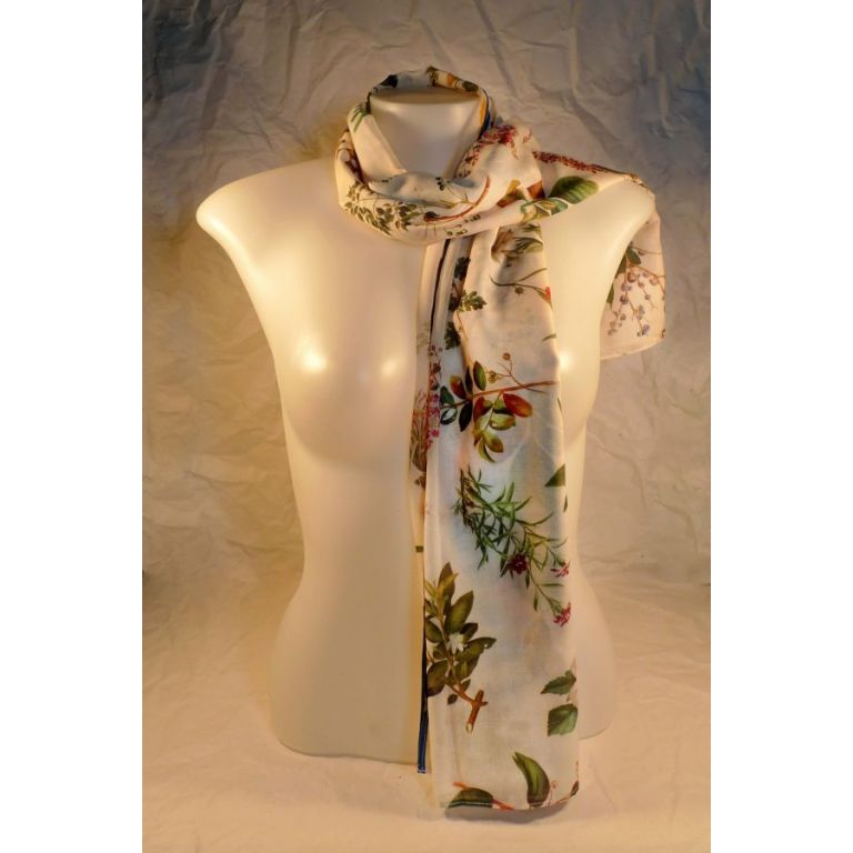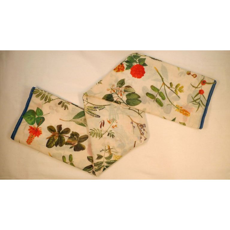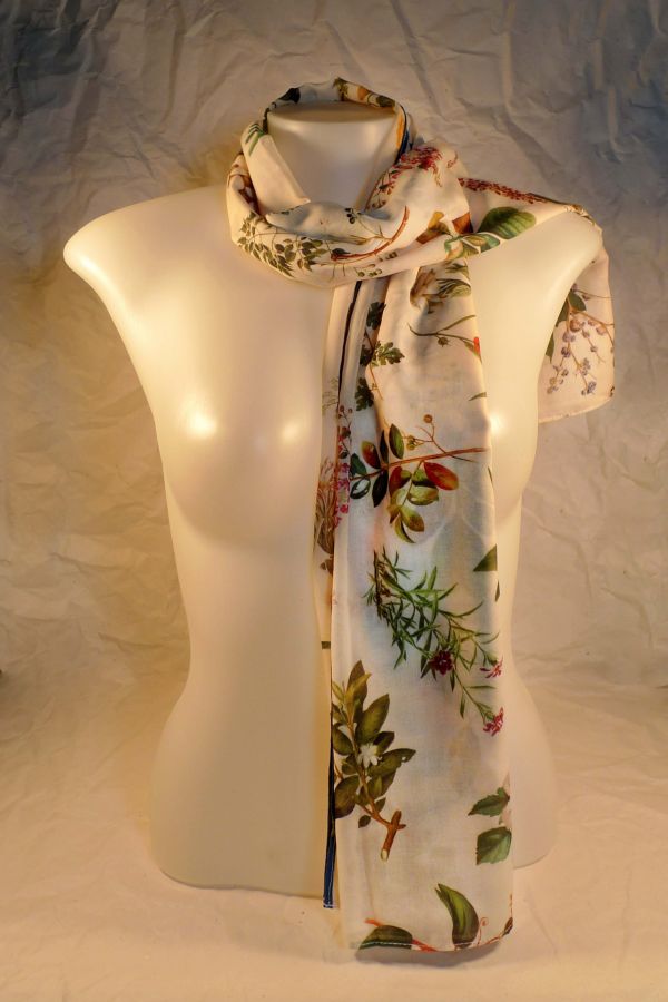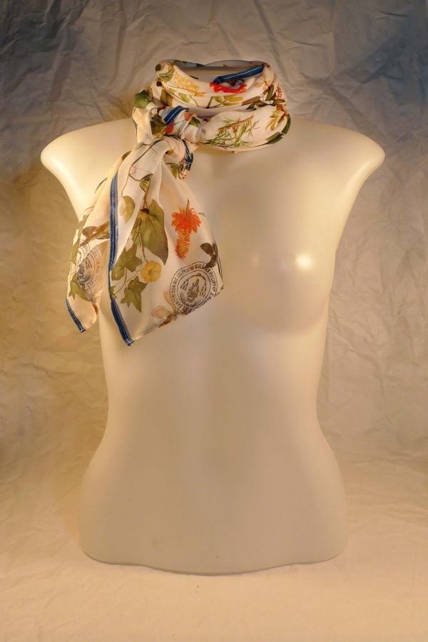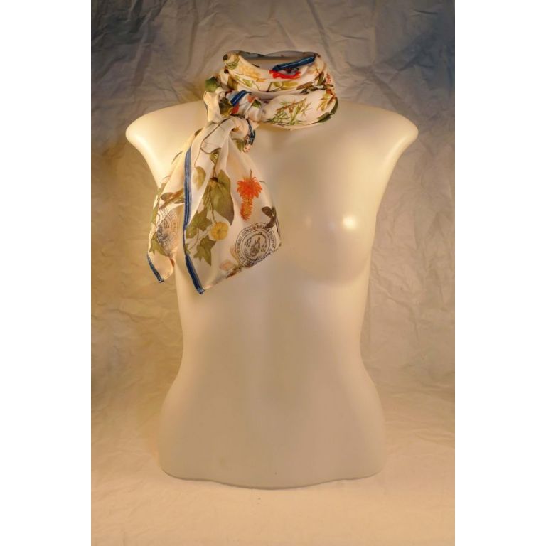 The images used to design this scarf are reproductions of flowers and leaves illustrations from the botanical book "Flora de Filipinas" by Fr. Blanco. It is a documentation of hundreds of Philippine plant species printed in 1837, and found in our library collections.