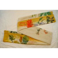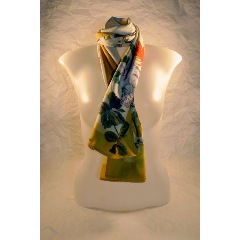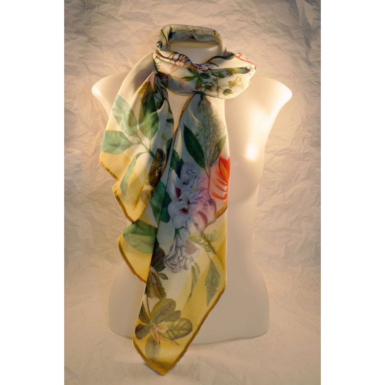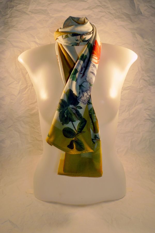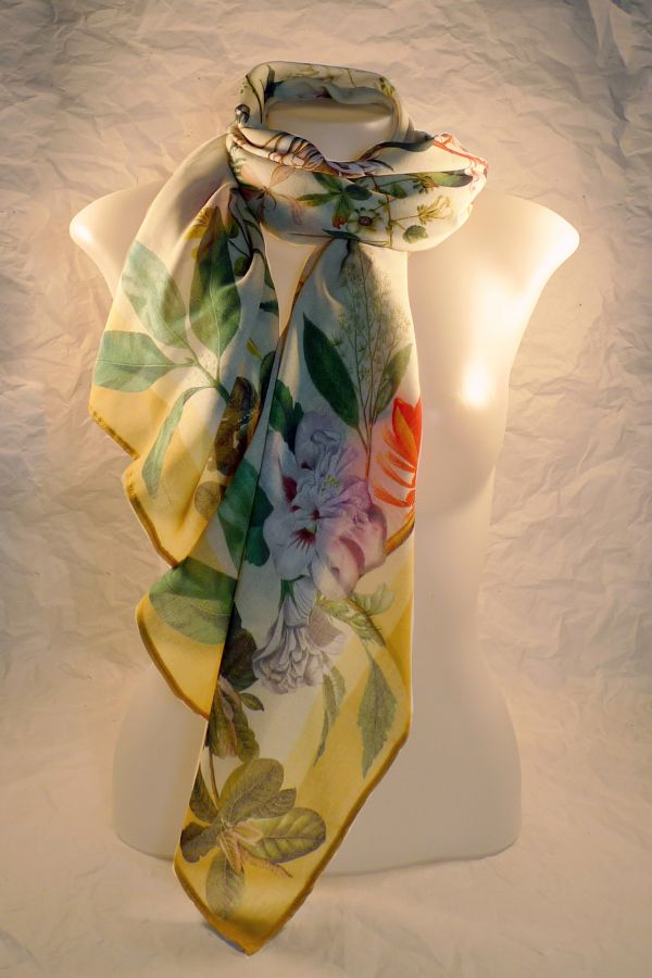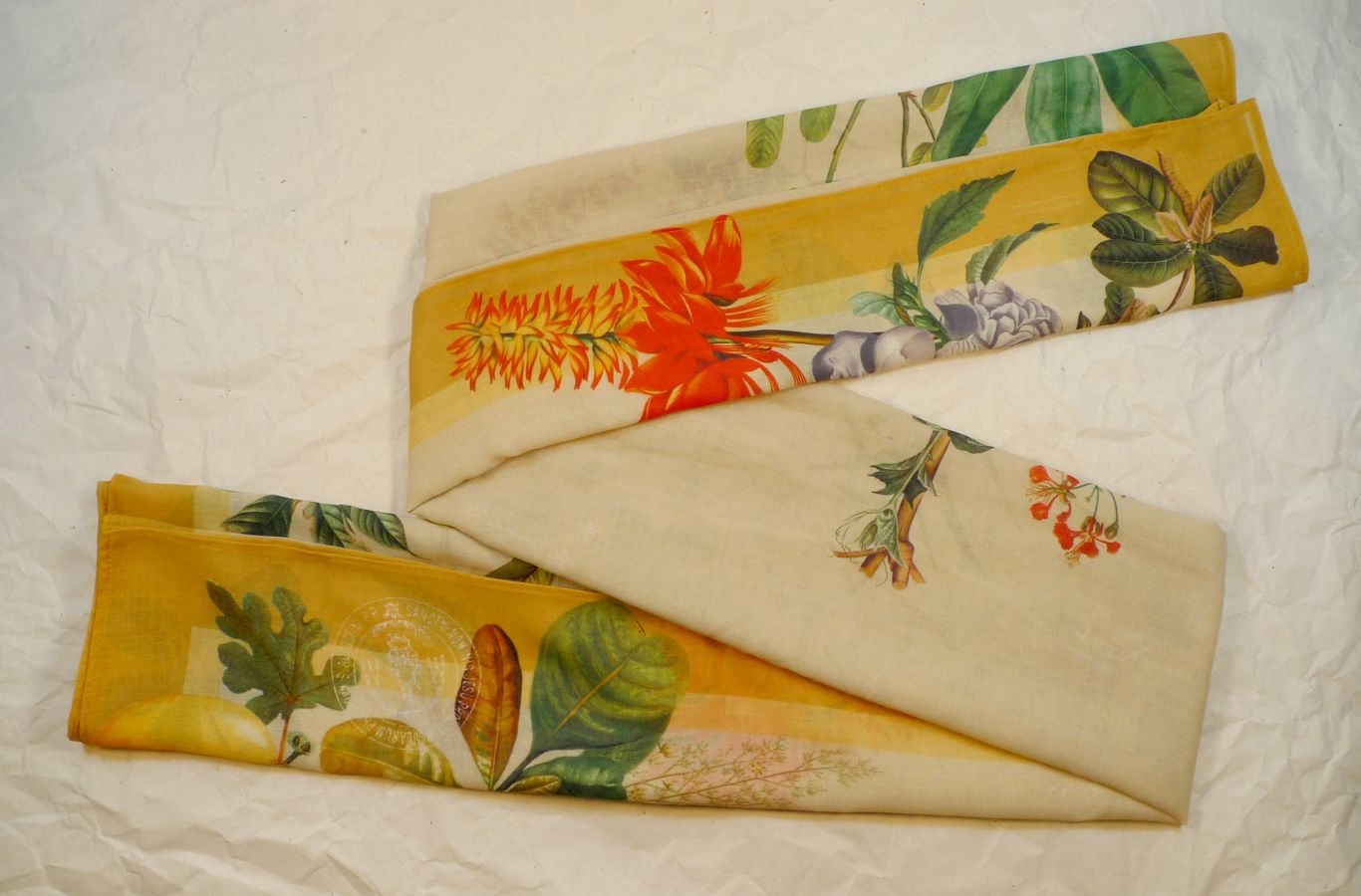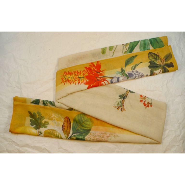 The images used to design this scarf are reproductions of flowers and leaves illustrations from the botanical book "Flora de Filipinas" by Fr. Blanco. It is a documentation of hundreds of Philippine plant species printed in 1837 and found in our library collections.