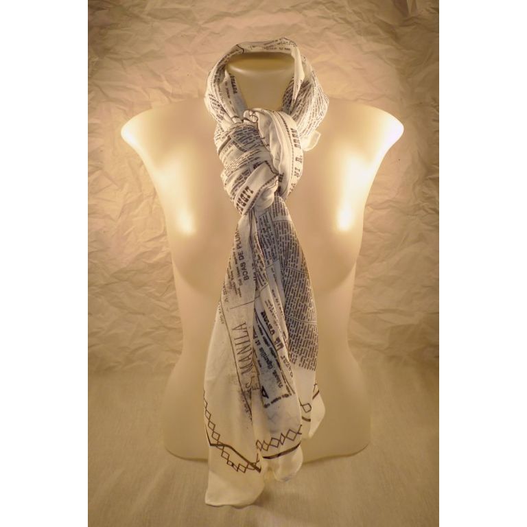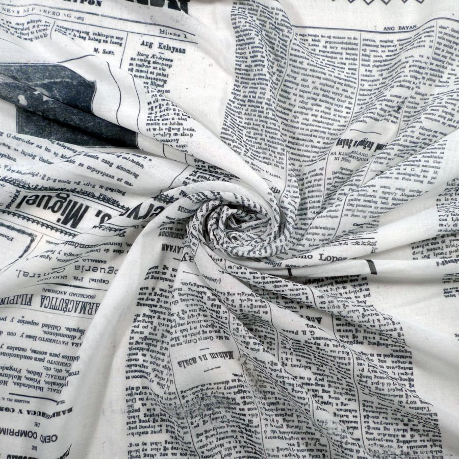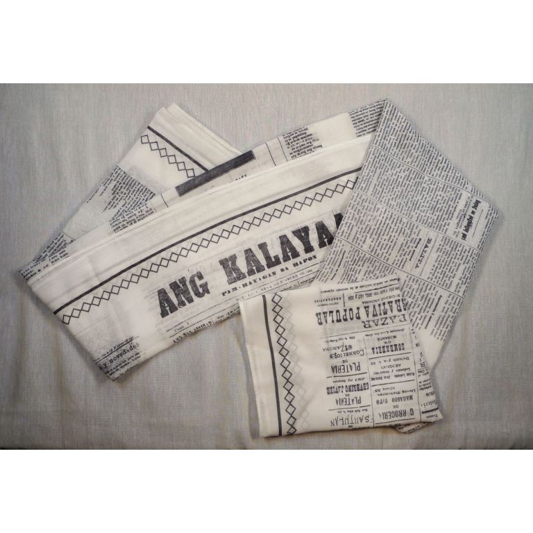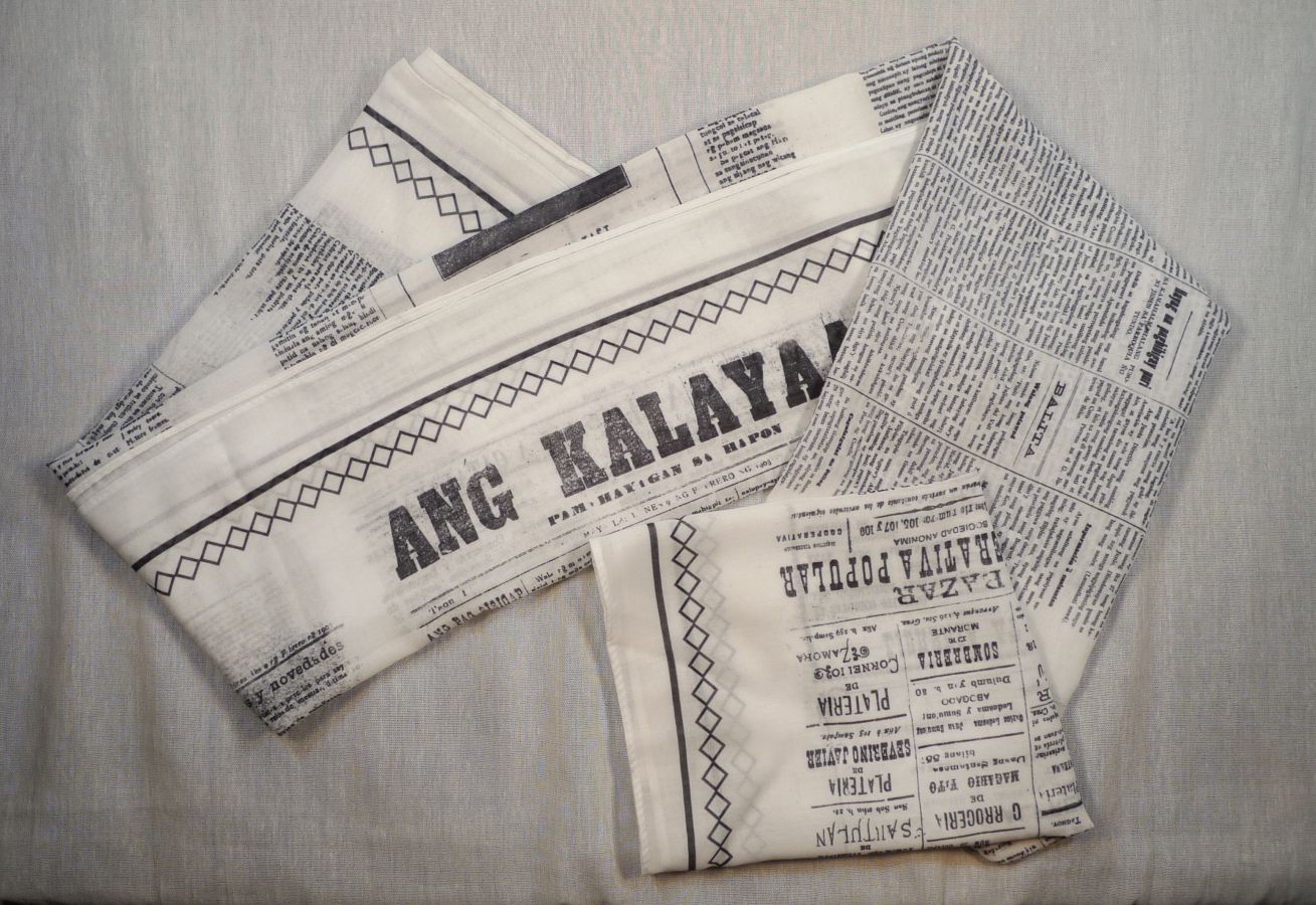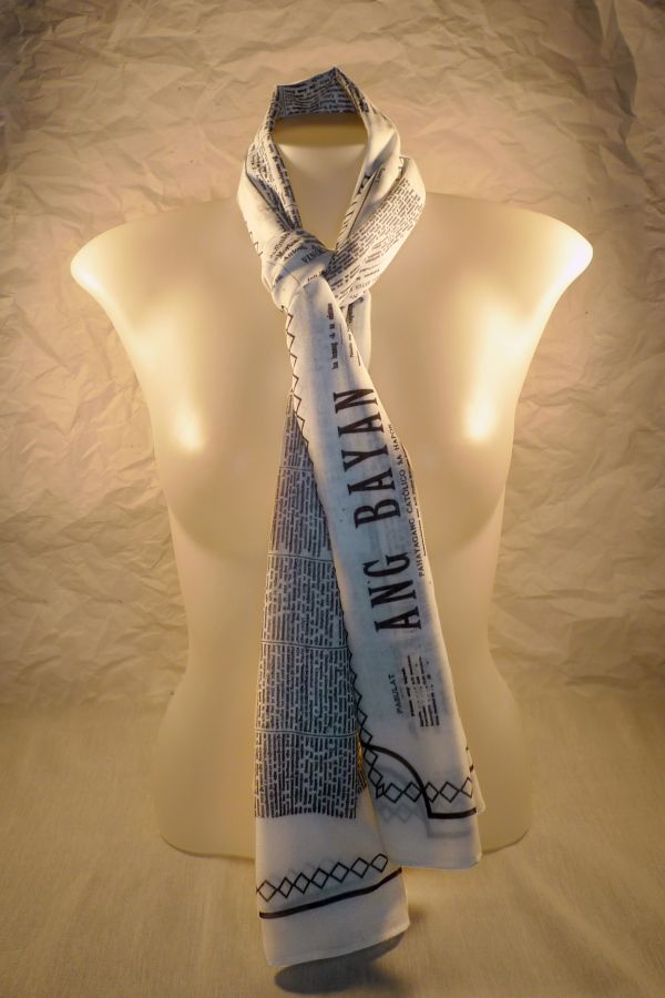 This scarf features pages from the afternoon newspapers Ang Kalayaan and Ang Bayan. These were printed in Tagalog at the beginning of the 20th century (1903).